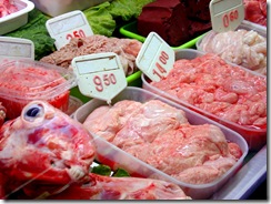 The mercato is noted for its seafood, but it seemed that beef held a more prominent place on the several days that I visited La Boqueria. There were more cold cuts than you could imagine, and many vacuumed packed cold cut selections for easy purchasing. Of the many sausages I wanted to try the morcilla, known to English speakers as blood sausages, and xoricos that I presumed were chorizo.
